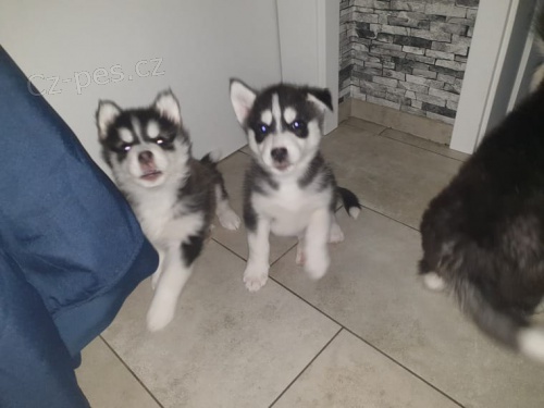 Typická štěňátka sibiřského husky, silná na prodej. Když jsou štěňata předána, jsou několikrát odčervena, očkována a štěpka a obdrží jejich domácí zvířecí identifikační číslo EU a rodokmen.