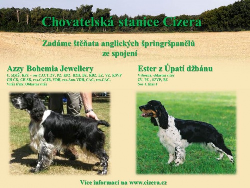 - CHS CIZERA zadá cernobila a hnedobilaštěňata ze spojení – Matka: Ester z Úpatí Džbánu. Výstavy: V1, Vítěz třídy, Oblastní vítěz. Zkoušky: ZV, PZ SZVP, BZ. Otec: Azzy Bohemia Jewellery. Výstavy: CH CZ, CH SK, res. CACIB, CAC, res.CAC, VDH, res. Anw. VDH. Zkoušky : „U“, MMŠ, ZV, PZ, KPZ – res. CACT, BZH, KBZ, LZ, VZ, KSVP. Odběr konec dubna 2013. Kontakt: info@cizera.cz, www.cizera.cz