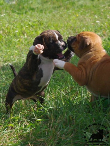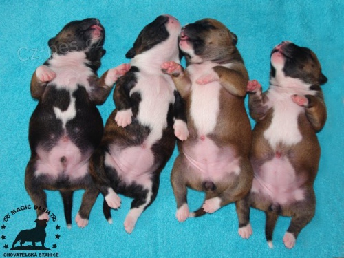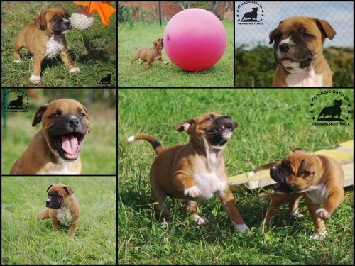 CHS Magic Dash nabízí štěňata stafordšírského bulteriéra, matka Amelie Black Machine, otec JCh.Basco Snow Bee Master. Štěňata jsou geneticky L2HGA/HC Clear, vyrůstají v blízkém kontaktu s našimi dětmi.Jsou čipovaná, očkovaná, odčervená. Samozřejmostí smlouva o záloze, kupní smlouva a chovatelský servis. Více na www.magicdash.eu , tel.č. 733343377