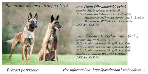 Přijímáme rezervace na štěňata BO s pp. 4 feny a 1 pes. Pracovní spojení. Štěňata budou vhodná do služby i k sportovní kynologii. Otec: Divin Olbramovický kvítek (BH, Mondioring), Matka : Wanda z Hückelovy vily (BH, IPO3, ZVV1, T1, úspěšná účastnice několika policejních závodů). Oba rodiče DKK A/A, DLK 0/0. Štěňata jsou očkovaná, čipovaná s europasem. Více info na http://www.pavelurban.org/ v sekci Štěňátka.