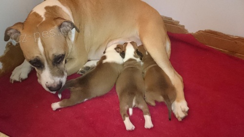 Americký stafordšírský teriér. Zadám nádherná zlatá s bílými znaky - štěňátka amstafa, nar. 5. 1. 2015, matka bez PP, otec s PP, štěňátka budou odčervená, očkovaná, odběr možný 25. února 2015. 6.000 Kč.