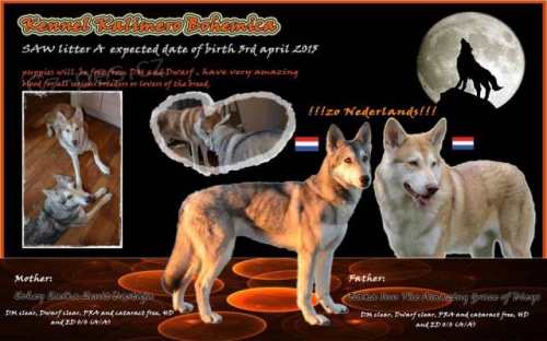 Chovatelská stanice Kalimero Bohemica zadá štěňata Saarloosova vlčáka z výjímečného spojení. Poprvé v ČR se narodí štěňata, jejichž rodiče jsou ze země původu. Celý vrh je po plně testovaných, zdravých rodičích. Hledáme seriozní majitele se zájmem o toto plemeno. Více informací na www.saarlooswolfhond.cz, na facebooku kalimerobohemica nebo na tel. +420739021210.