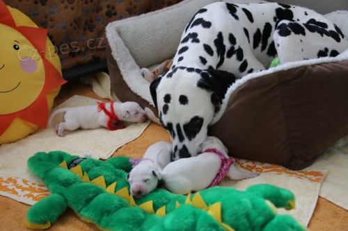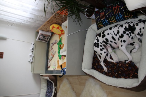 Dalmatin štěňata. Naše ch.s. Assonanza bere záznamy na štěňátka (vrh B), narodilo se 6 pejsků (5 černě a 1 hnědě tečkovaných) a 3 fenky (všechny černě tečkované). Jedná se o velice zajímavé nepříbuzenské spojení (krytí v Anglii) s předpokladem výborného zdraví s vyrovnanými přátelskými povahami bez agresivity a bojácnosti! Podrobné info o tomto spojení včetně naší cesty do Anglie naleznete na www. K odběru od 8.6.2015.