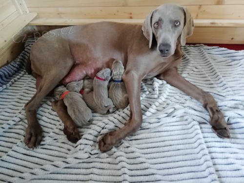 Výmarský ohař - chov. stanice Šedé štěstí zadá štěňátka výmarského ohaře z vrhu B, tři fenečky, dva pejsky, narozená 8.6.2019, oba rodiče využíváni v lovecké kynologii, bezkonfliktní vyrovnané povahy, oddaní rodinní společníci. Otec: Pepe Elike Bohemia-český šampion práce, PZ, SVP, LZ, VZ-vše I.cena, Memoriál K.Podhajského, Memoriál R.Knolla Matka: Abby Gail Silver Collection- ZV, SVP, PZ-vše I.cena , štěňátka budou k odběru 1.-2.8.2019.